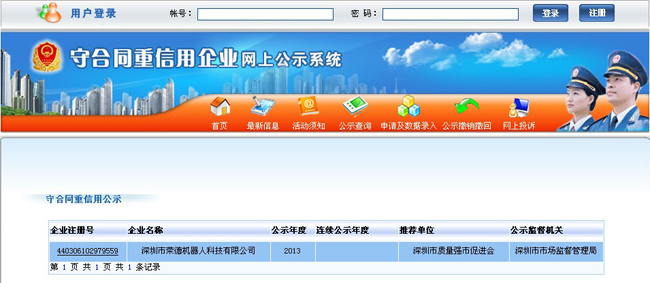近日,廣東省工商行政管理局向社會(huì)公示了全省“守合同重信用”企業(yè)名單,深圳市榮德機(jī)器人科技有限公司喜獲上榜,首次榮獲該榮譽(yù)稱號(hào)。